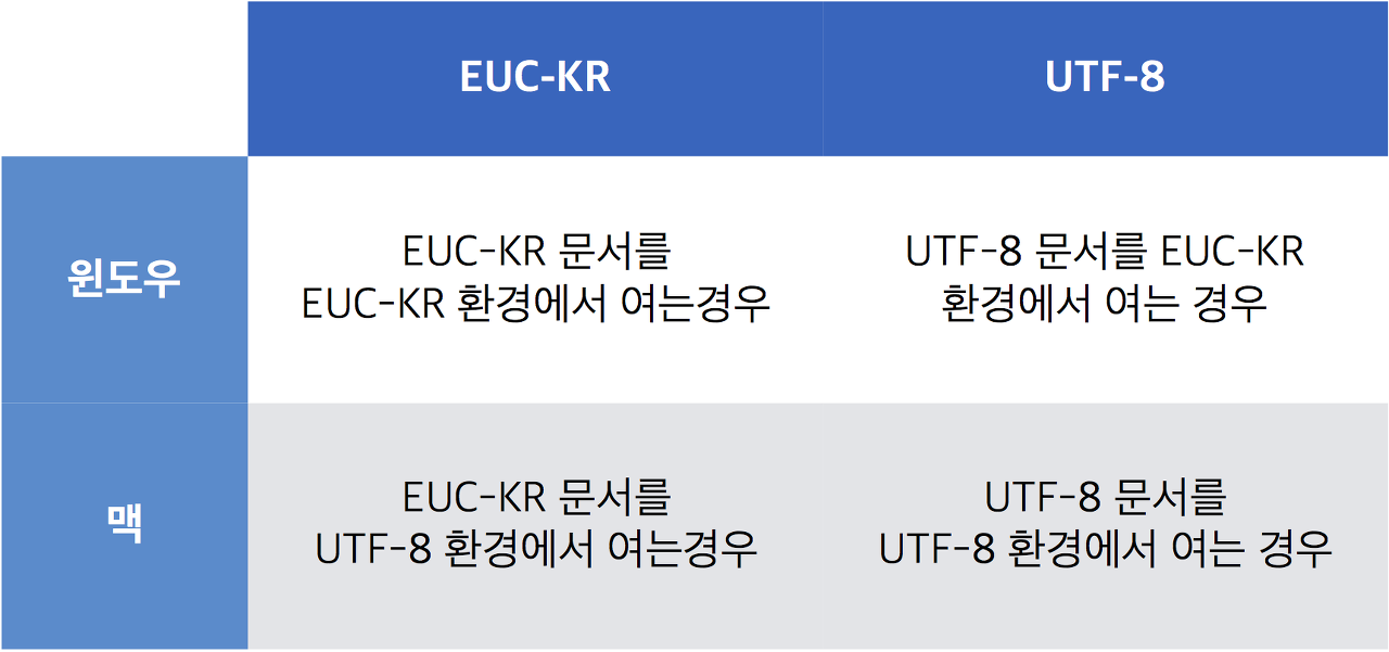 Mac 에서 작업하여 Export 한 csv 문서는 일반적으로 “UTF-8” 이라고 하는 유니코드 형태로 저장이 됩니다. 반면 Windows 환경에서 Export 된 csv 문서는 “EUC-KR” 인코딩으로 저장이 됩니다.