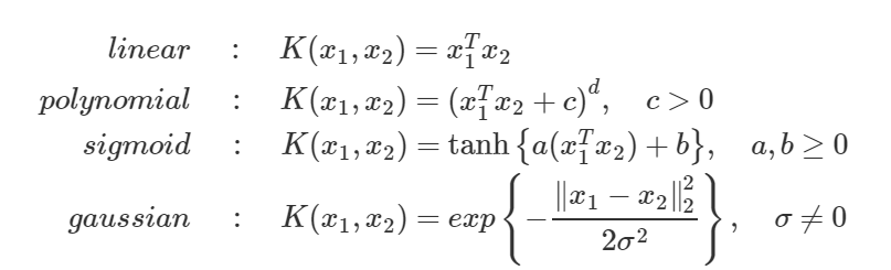 기존 SVM에 해당하는 Linear 커널은 선형 분류경계면을 만들어냅니다. Polynomial 등 이 글에서 소개하는 커널은 비선형 경계면이 만들어집니다. 다음과 같습니다.