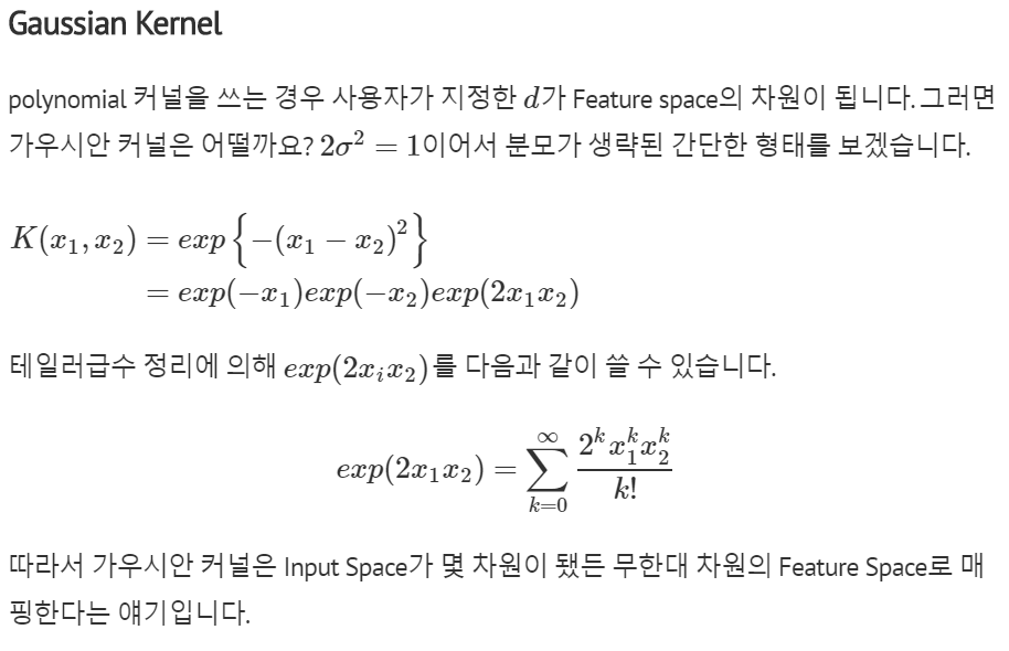 polynomial 커널을 쓰는 경우 사용자가 지정한 d가 Feature space의 차원이 됩니다. 그러면 가우시안 커널은 어떨까요?