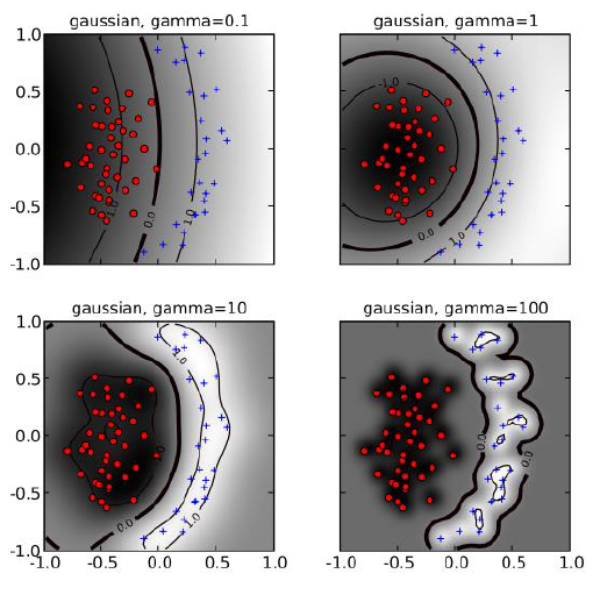 이번엔 가우시안 커널을 보겠습니다. gamma는 지수의 분모에 해당하는 하이퍼 파라메터인데요. 작을수록 마진이 넓어지는 걸 확인할 수 있습니다.